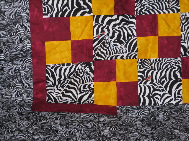 Monday morning was the class on adding borders. I was pleasantly surprised to find as I worked on the zebra top that the quilt was almost square. I did err in trimming one corner of the inner border so the line is not as straight as it could be going into the corner, but I may be the only one who notices, especially as we sandwich and quilt next Monday.