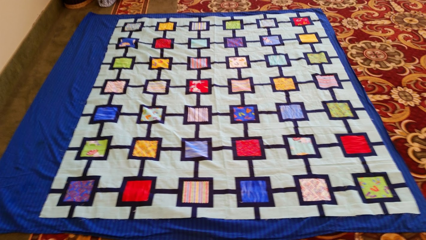 L. StarBright for Christopher. I need to take a current photo as his is fully pieced now. Same pattern but in Orlando Magic colors. The quilting motifs will be very different across the two quilts.